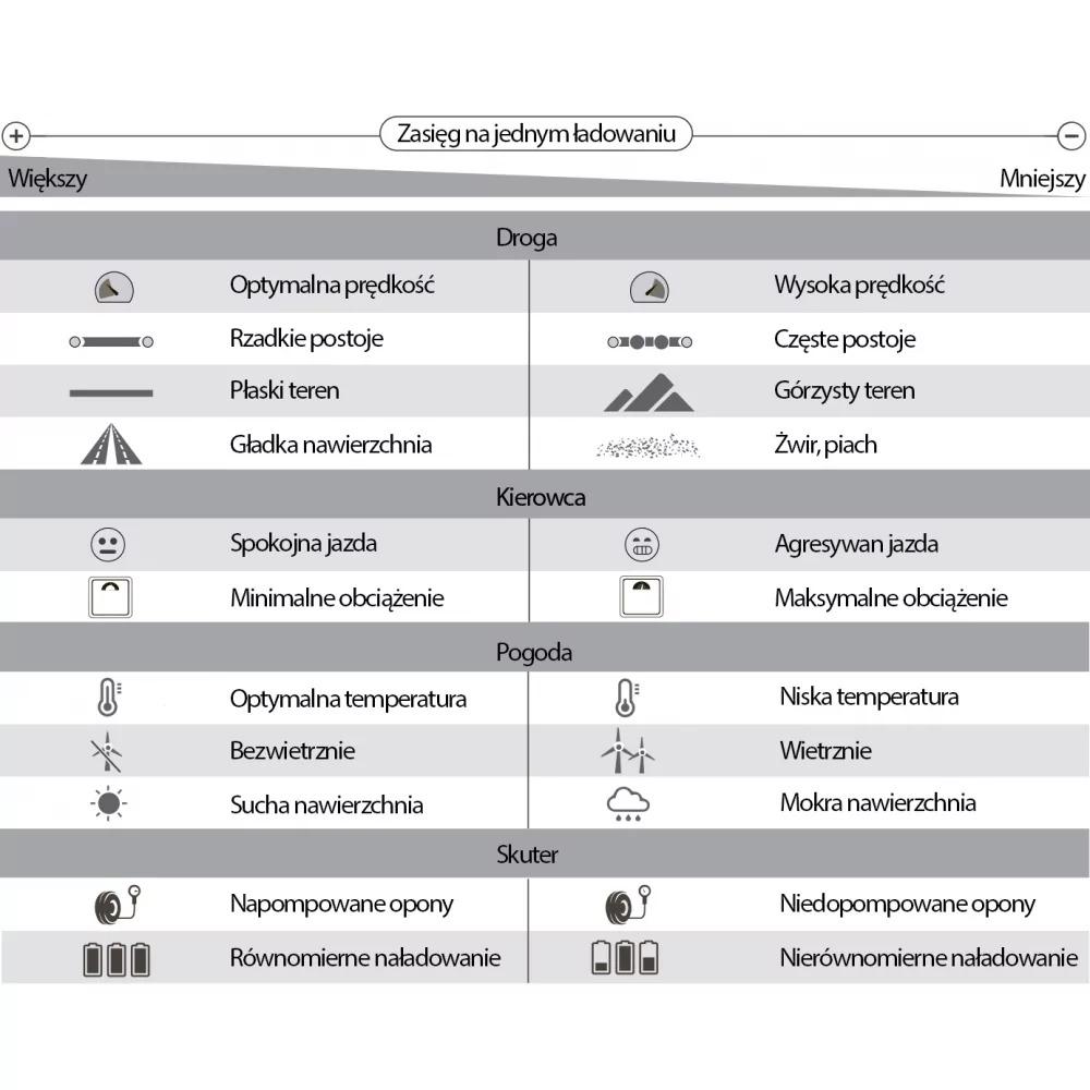 • Info: *Zasięg zależy od wagi użytkownika, warunków atmosferycznych, prędkości oraz podłoża.