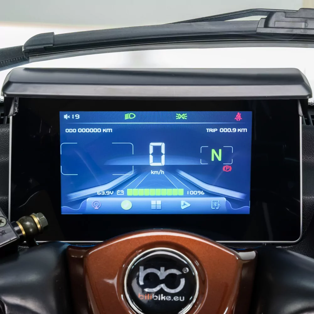 Jednym z największych atutów SIGMA 3 GEL jest zabudowana kabina, która skutecznie chroni przed deszczem, wiatrem i chłodem. Dzięki temu skuter może być używany przez cały rok, niezależnie od pogody. Drzwi boczne ułatwiają wsiadanie i wysiadanie, a duże panoramiczne szyby zapewniają doskonałą widoczność na trasie.